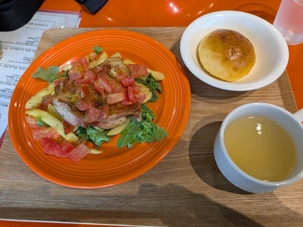 トマト🍅とバジルが添えられた鶏ももステーキはモチモチした食感に仕上がっていて