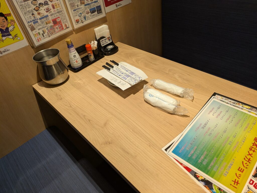 明るい木目のテーブルに、壁にはあの“やみつきになる笑顔のキャラ”がずらり。